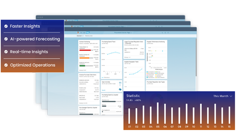 SAP’s استنادًا إلى قاعدة بيانات SAP HANA المبتكرة الوصول إلى إحصائيات وتحليلات الأعمال في الوقت الفعلي لاتخاذ قرارات أسرع وأكثر مرونة. تساعد الميزات المضمنة مثل الذكاء الاصطناعي والتعلم الآلي على تطوير العمليات التجارية وأتمتتها لتحقيق عمليات مثالية وأكثر كفاءة.