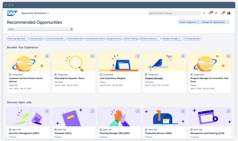 بناء قوة عاملة جاهزة للمستقبل باستخدام ذكاء المواهب من SAP’s . استخدم أدوات التوظيف والتوجيه المتقدمة في نظام SAP’s. الموحد لدفع القرارات القائمة على المهارات والمحاذاة.