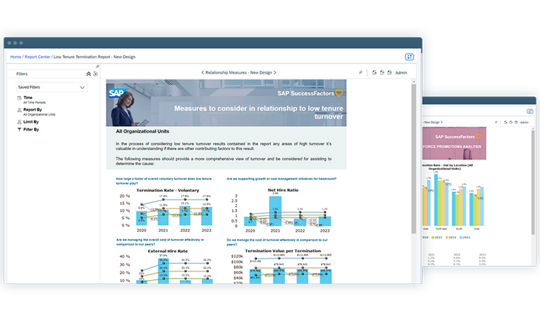 الاستفادة من أدوات التحليلات المتكاملة وتخطيط القوى العاملة من SAP’s للكشف عن الاتجاهات في التنوع والمشاركة والدوران. يمكنك الوصول إلى أكثر من 2000 مقياس محدد مسبقًا للموارد البشرية والمواهب للحصول على رؤى قابلة للتنفيذ.